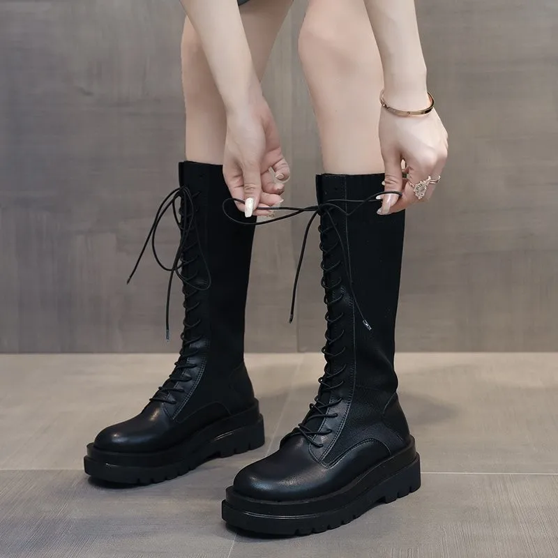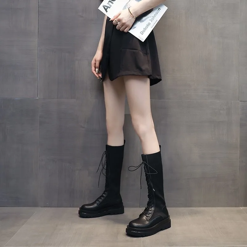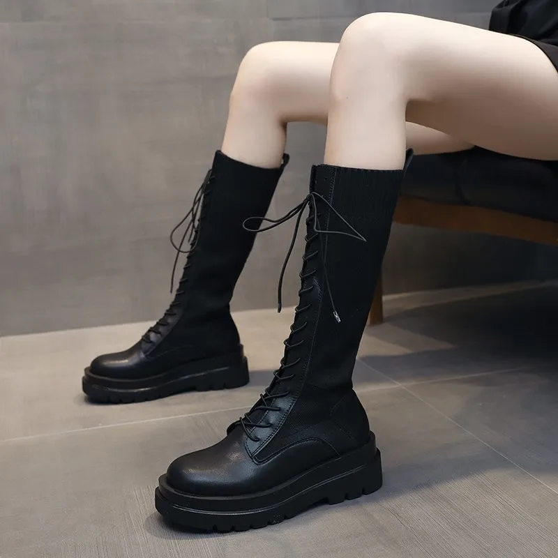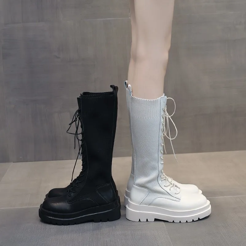 Women Sock Boots Autumn Lace up Mid Calf Boots Female High Platform Sock Shoes Fashion Beige Stockings Boots Mid-calf
