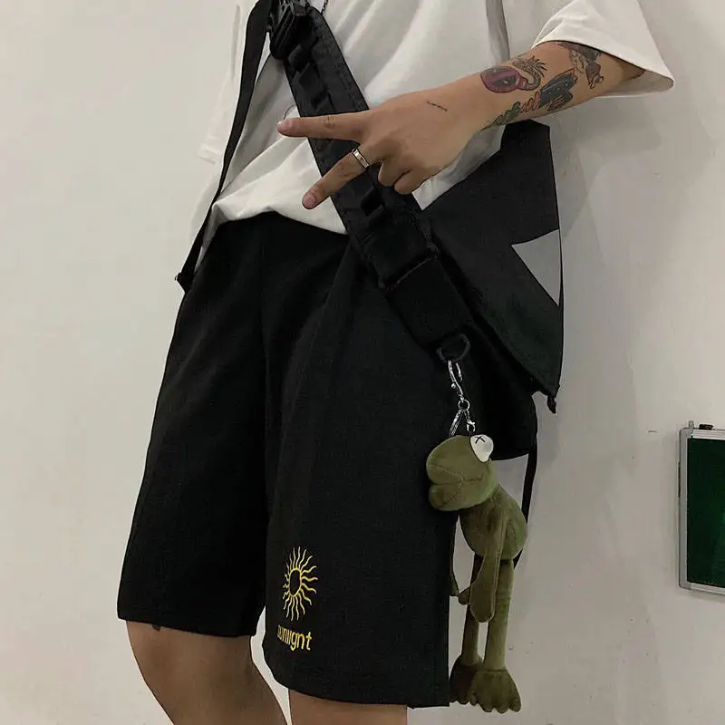 Women Summer Loose Solid Wide-leg Harajuku Casual Simple All-match Женские штаны black Large size Sun and moon embroidery Shorts