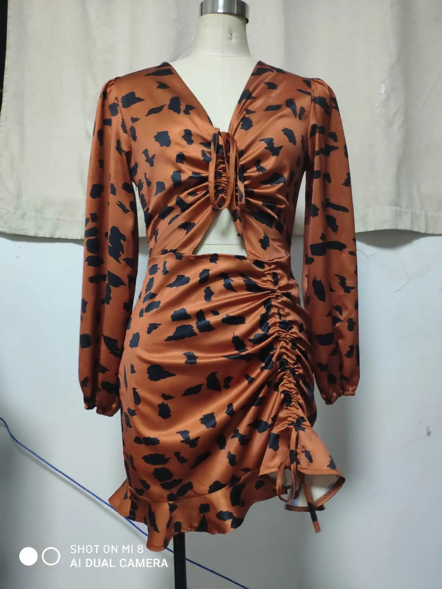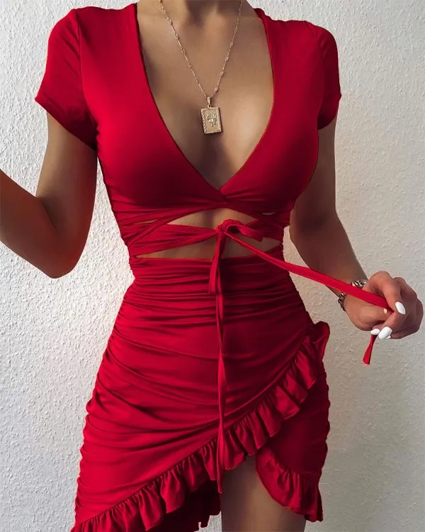 Women Summer Ruffles Cut Out Design Leopard Print Dress Elegant Fashion V-neck Ruffle Party Mini Dress Ladies Holiday Beach