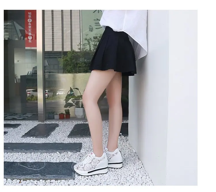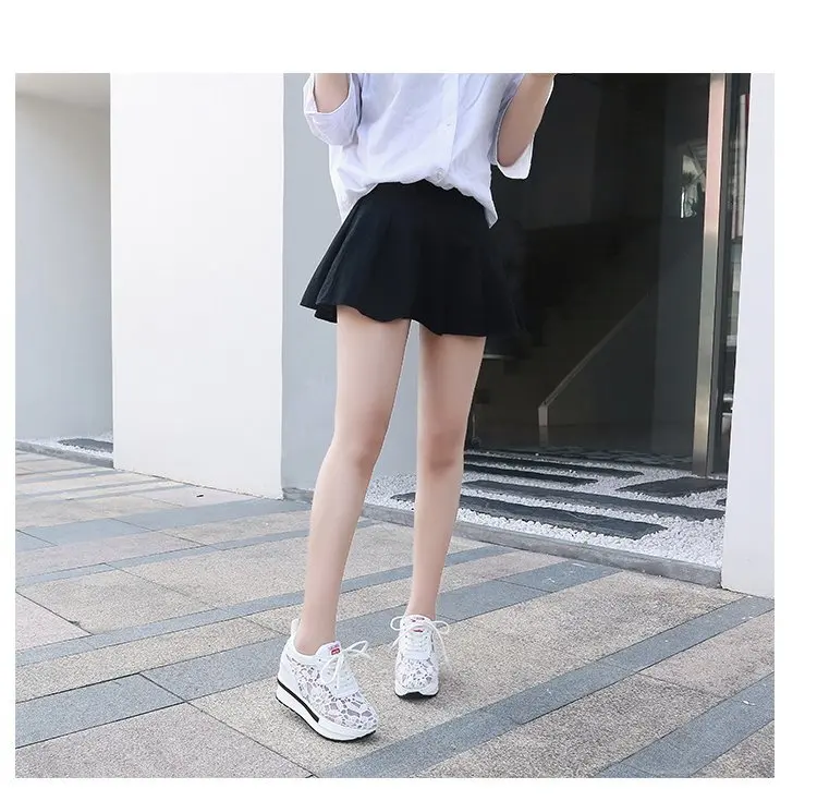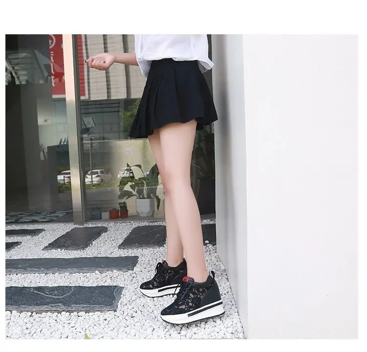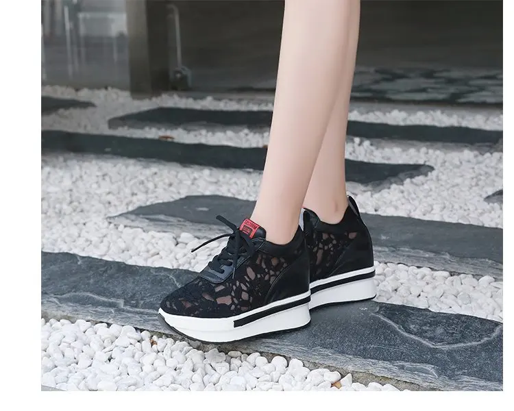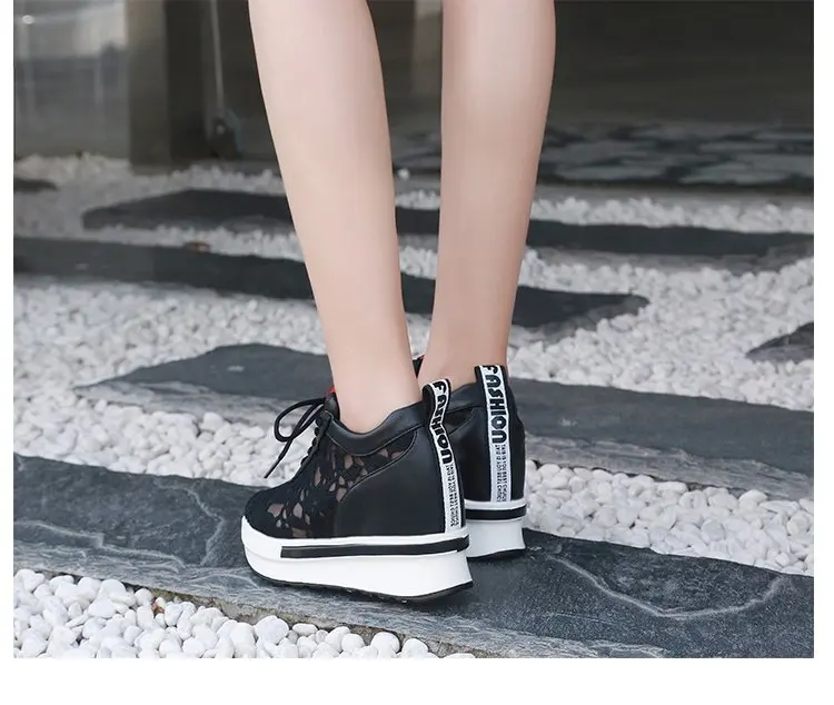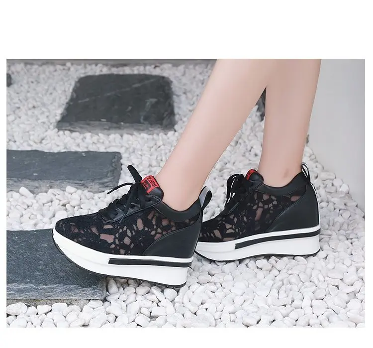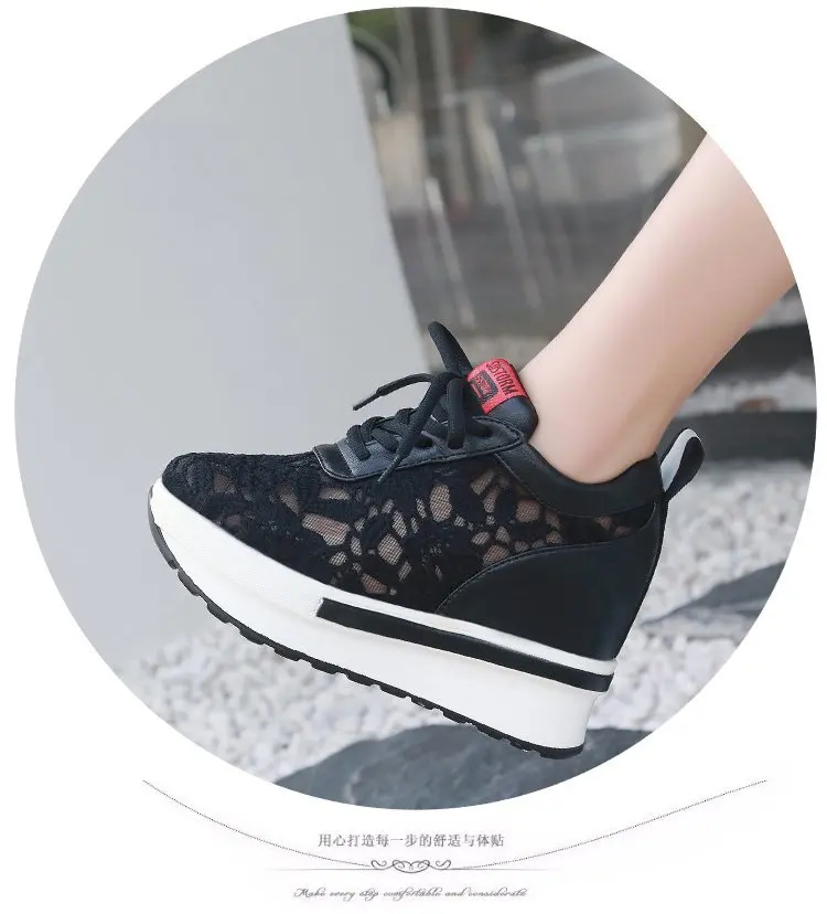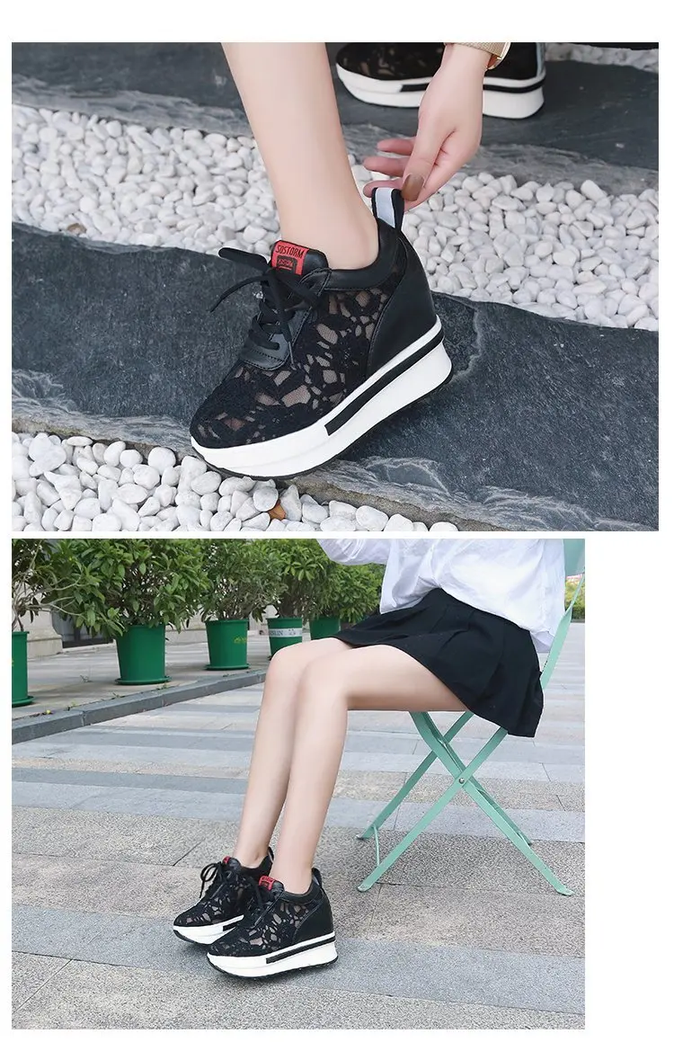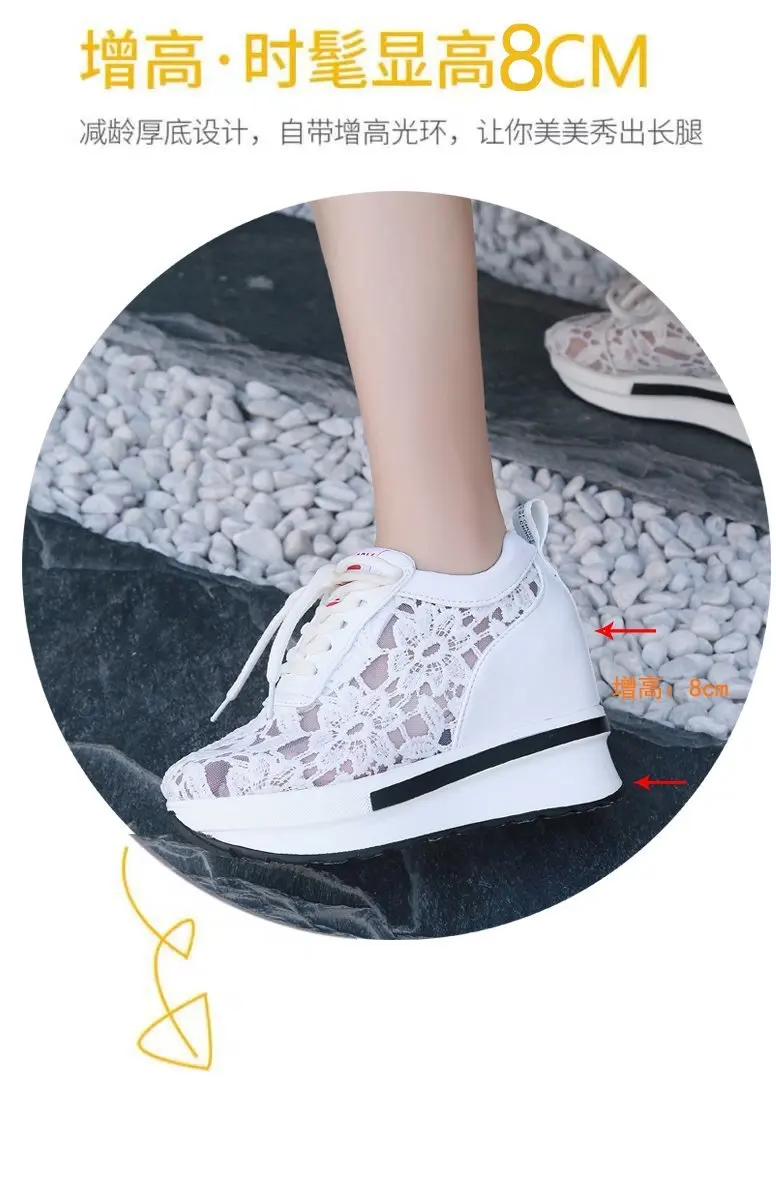 Womens Lace Mesh Breathable Sneakers Wedge Hidden High 8cm Heel Shoes Lace Up Black White New 2021