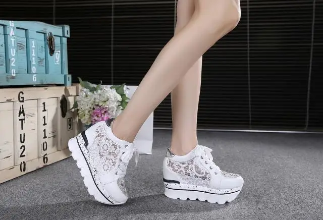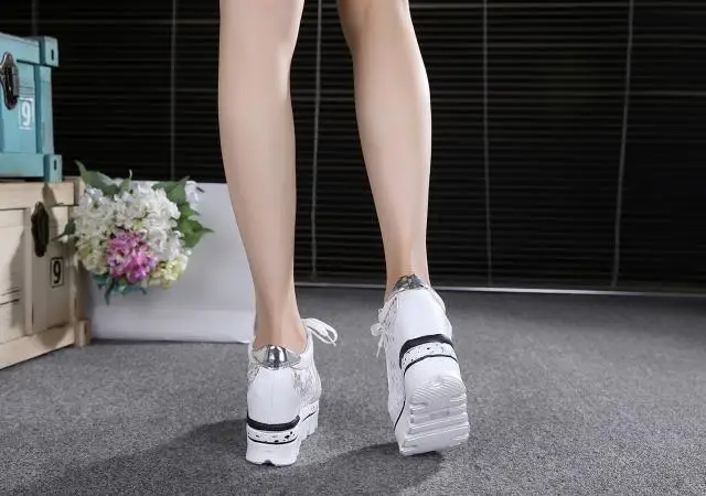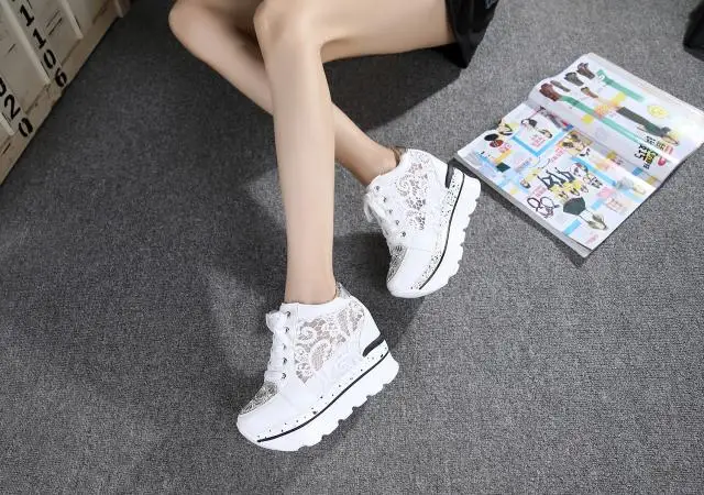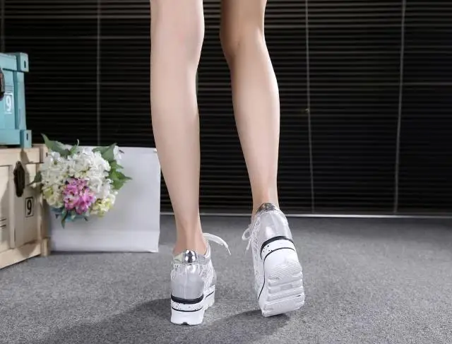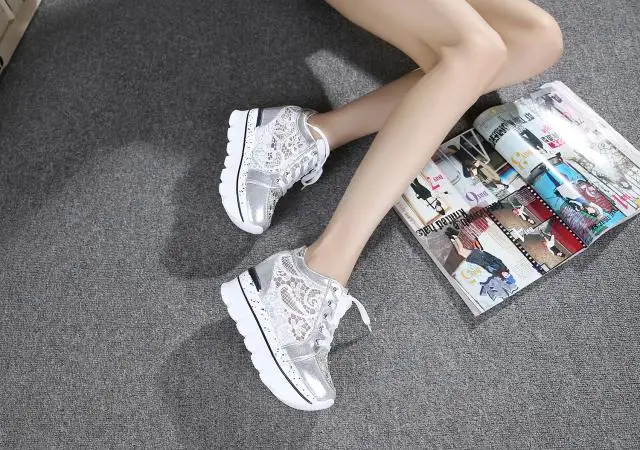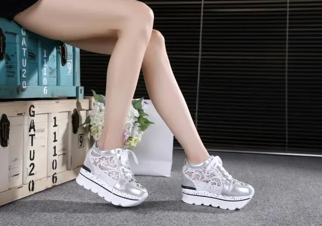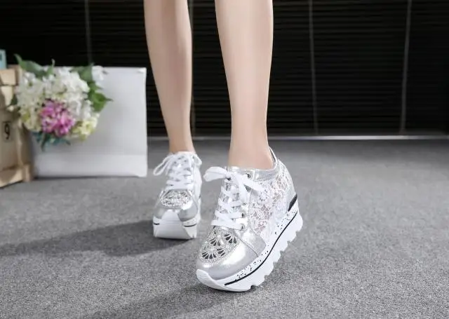 Womens Summer Lace Rhinestones Hollow Platform Sneakers Wedge Hidden Heel Shoes Super High 10cm White Sliver B165