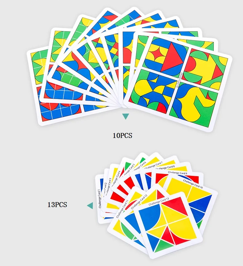Draw a challenge card and place it in a place where everyone can see it. Remember it together for 10 seconds, then flip the challenge card to the back. Use your memory and the prompts on the back of the challenge card to spell out the pattern. After putting it together, shout "I'm done".
