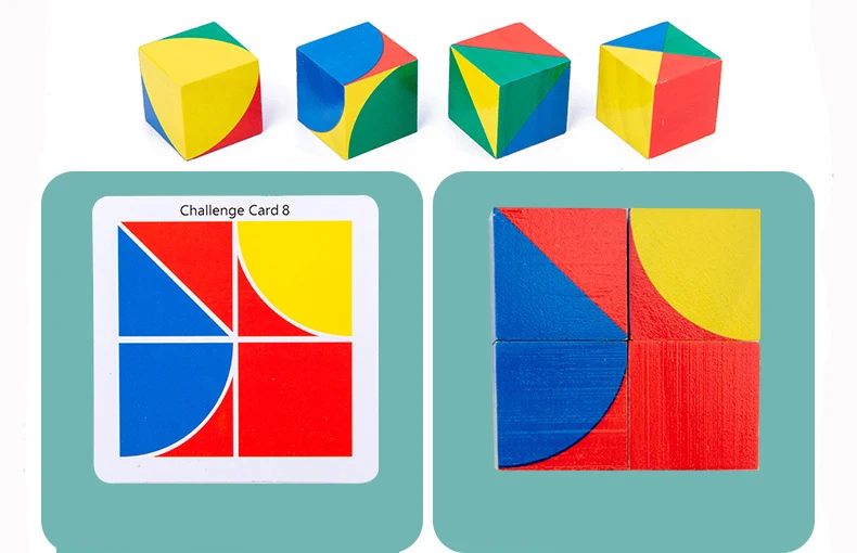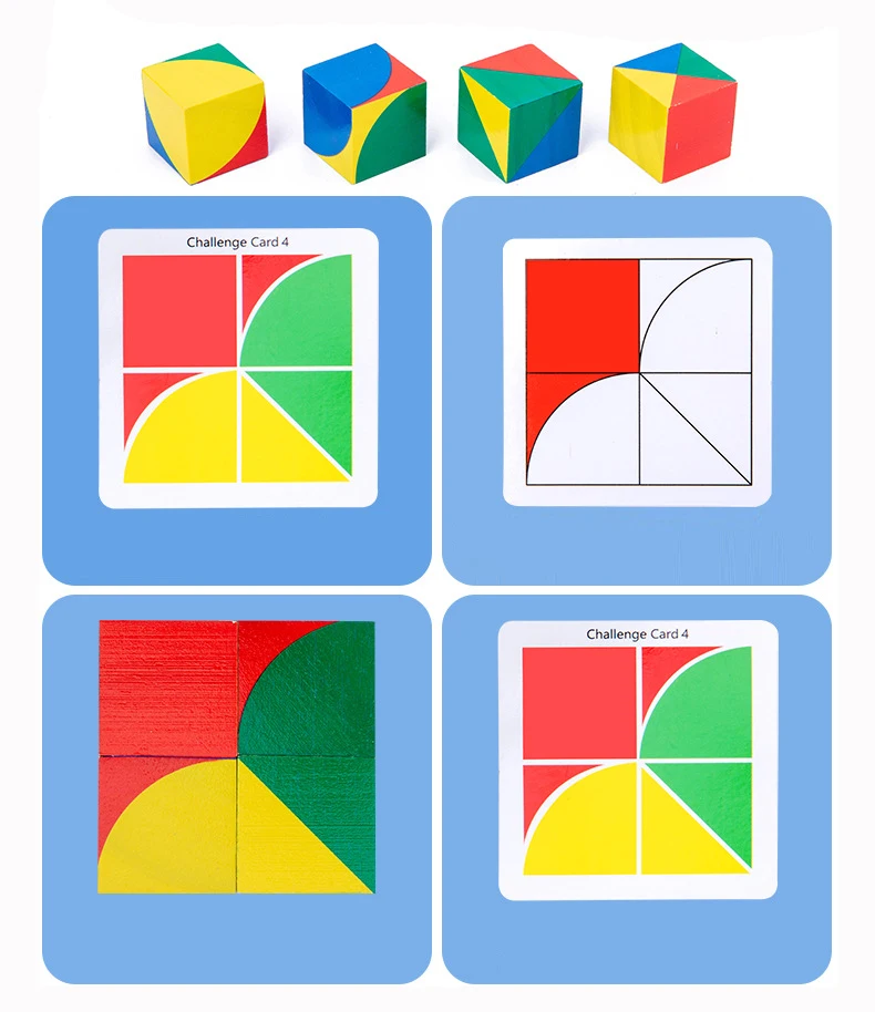 Draw a challenge card and place it in a place where everyone can see it. Use your four cubic blocks to quickly piece together the pattern on the challenge card.