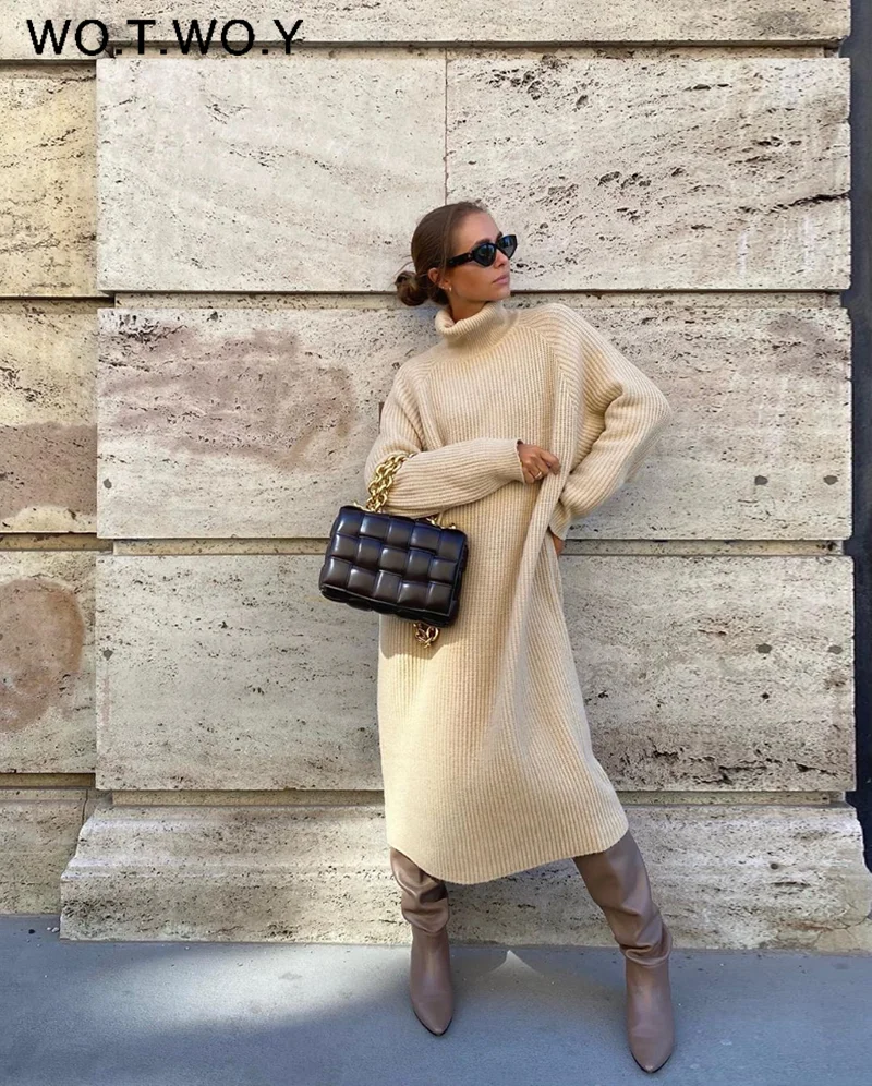 WOTWOY Turtleneck Oversized Knitted Dress Women Long Sleeve Casual Loose Dresses Women Autumn Winter Mid-Calf Knit Maxi Dresses